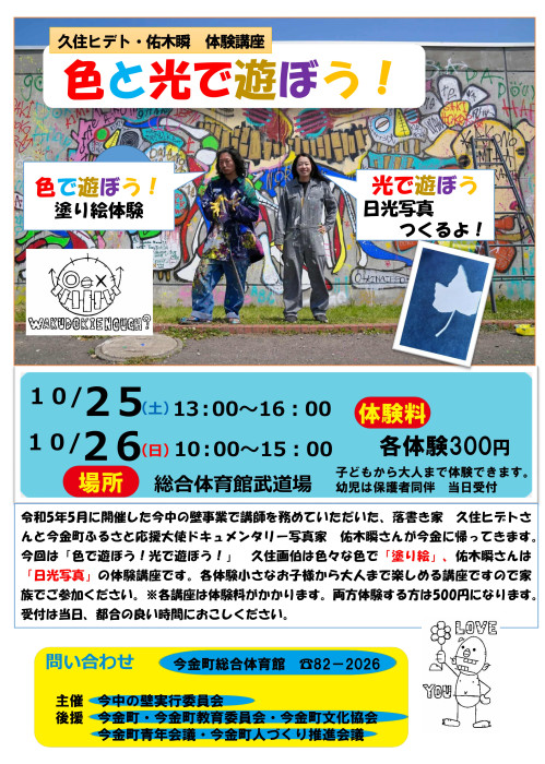 久住ヒデト・佑木瞬 体験講座「色と光で遊ぼう!」 令和7年10月25日(土)~26日(日)にふるさと応援大使の佑木瞬氏(先生)が今金に帰ってきます! 令和5年5月に開催した今中の壁 […]