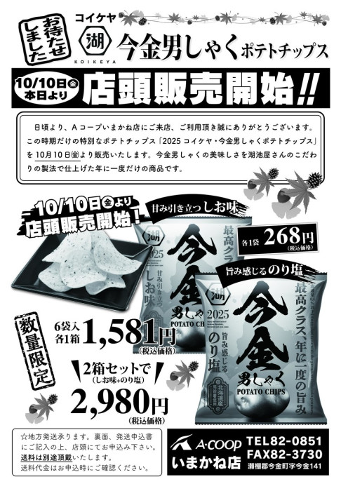 ご案内遅くなりましたが今年も今金男しゃくのポテトチップスが販売開始となりました!